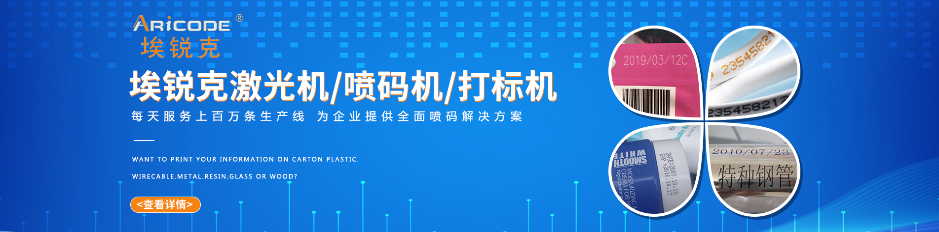 埃锐克是一家专业的打标产品服务供应商,是专门从事开发、生产及销售各类喷码机及其耗材的专业公司。我们的产品广泛应用于食品、饮料、医药、汽车零部件、电子、化妆品、电线电缆、建筑材料、化工等行业。无论是产品标识,产品追溯,防伪等等,我们总能站在您的角度为您提供高质量的经济有效的解决方案。